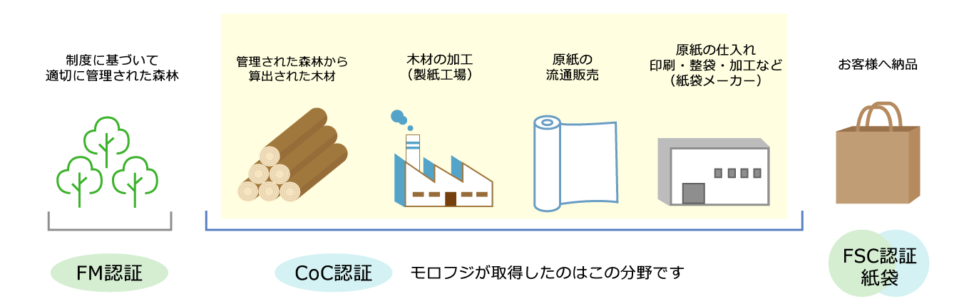 FSC(Forest Stewardship Council®:森林管理協議会)が作成した基準に沿って適切に管理された森林やその森林から切り出された木材の適切な加工・流通を証明する制度です。 この制度は国際的に展開されている認証制度であるため、認証製品を選択することで世界の森林保全に貢献することに繋がります。 株式会社モロフジはFSC森林認証のひとつであるCoC認証を取得し、FSC森林認証紙を使用した紙袋のご提供が可能です。