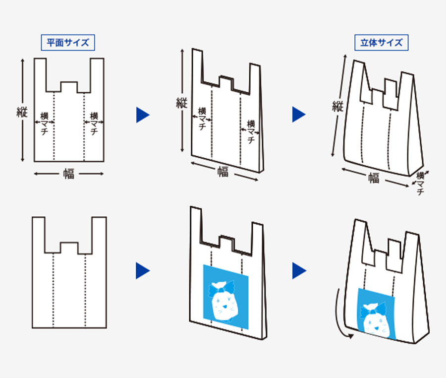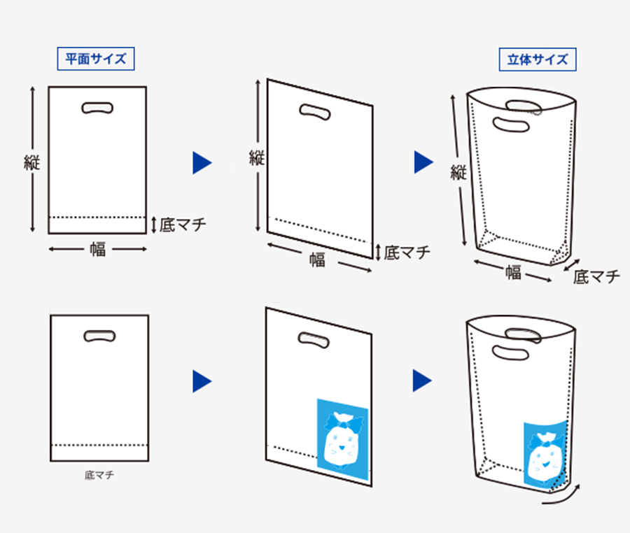 ※袋の下部が「袋の底」に回った分だけ縦の長さが縮みます。