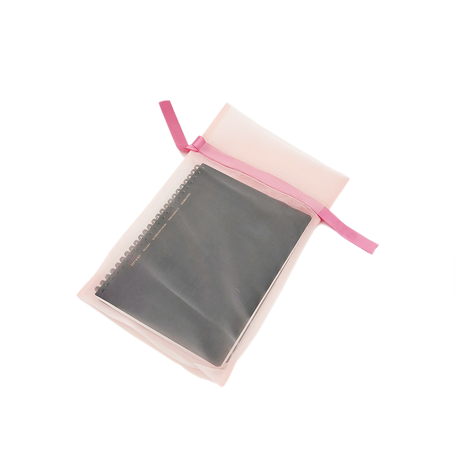 例:A5サイズのノートを入れたイメージ。表面はメッシュ加工で透明度が高い仕様になっています